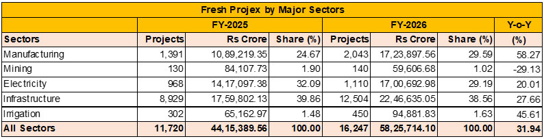 The sectoral picture in FY2026 showed that the rise in fresh investment was led by Manufacturing, supported by Renewable Power, while infrastructure continued to account for the largest share.