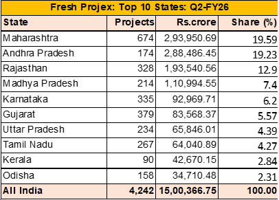 A couple of super mega projects saw the aggregate fresh investment by the Foreign entities increase by 69.33 percent to Rs 2,30,111.27 crore. This was despite the decline in the number of new projects from 141 in Q2/FY26 to 115 in Q3/FY26. The Foreign share increased to 14.66 percent from 9.06 percent (+5.60 pp), partially cushioning the broader private slowdown, but also indicating higher dependence on a small set of super/mega projects. A Rs 98,000 crore AI Data Centre of Digital Connexion at Visakhapatnam, Andhra Pradesh and a Rs 24,000 crore Closed Loop Pumped Storage Project of Greenko Energies in Telangana were the two super mega projects announced in Private (Foreign) sector.